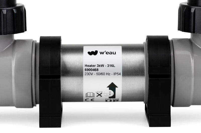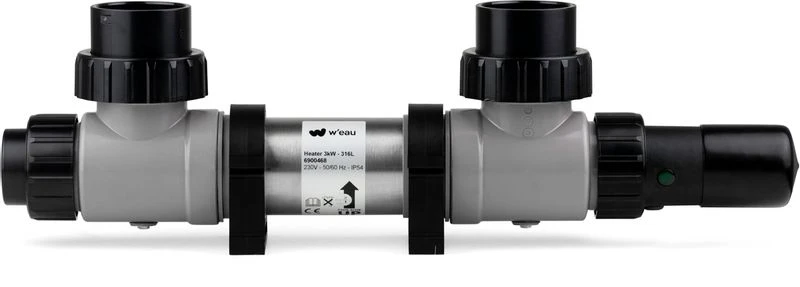 De W’eau Profi Heater gebruik je voor het verwarmen van je zwembadwater. De Profi Heater is voorzien van een regelbare thermostaat. Het binnenwerk van de behuizing en het verwarmingselement met temperatuurvoeler zijn gemaakt van roestvrij staal. De Profi Heater kan door middel van een slang (Ø25, 32 en 40 mm) of PVC buis (Ø50 en 63 mm) aangesloten worden.